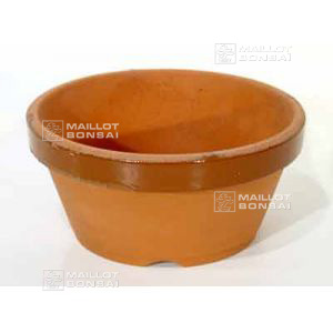 Diamètre extérieur 215 mm. Diamètre intérieur: 195 mm. Hauteur extérieure/intérieure :105/85 mm. En terre fine de qualité avec collerette émaillée, gros trou de drainage et trous de fixation des fils d'attache. Forte résistance au gel. Ce type de pot permet l'obtention d'une motte aérée et le développement d'un nébari régulier.